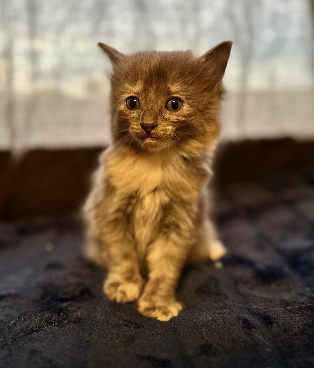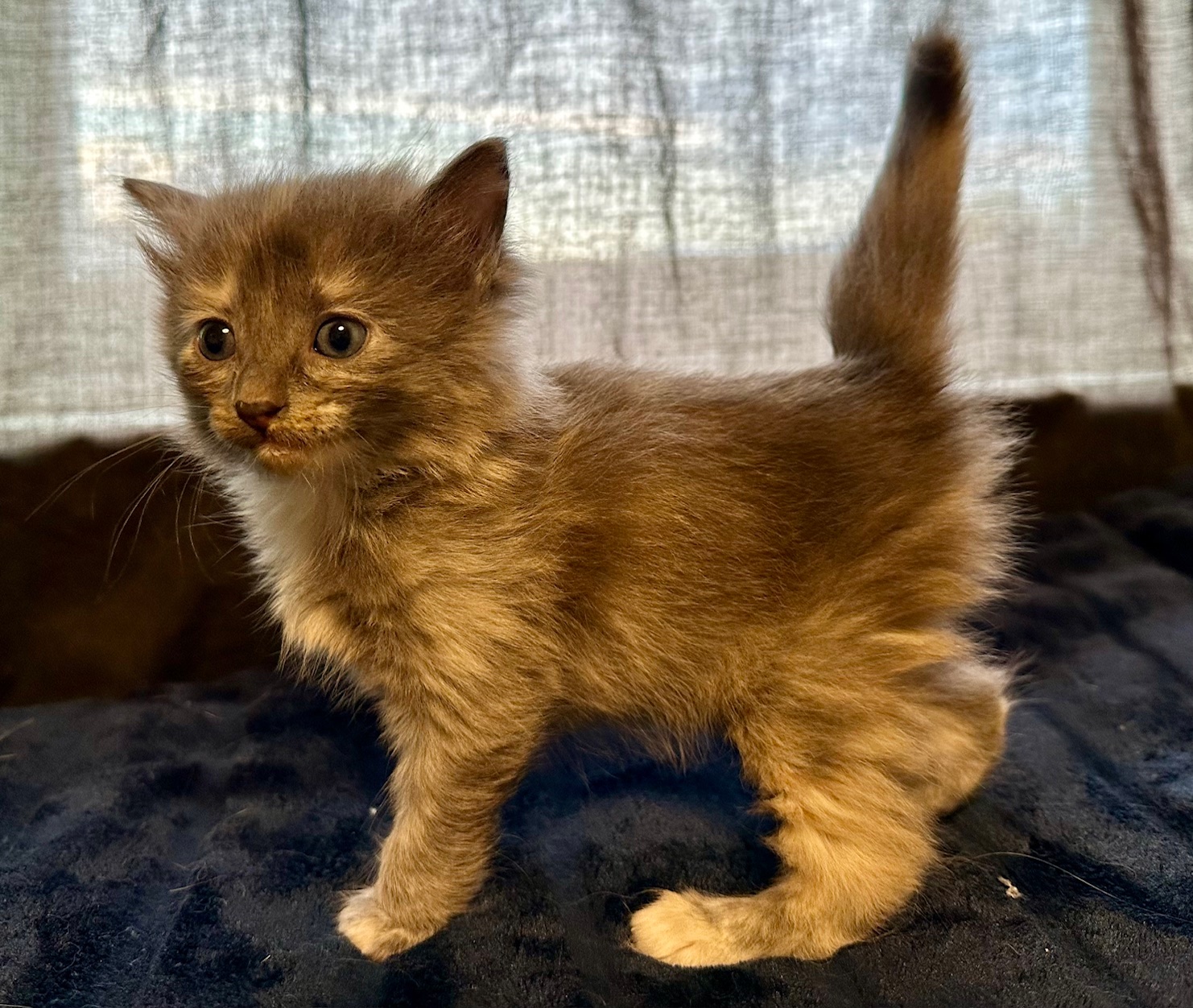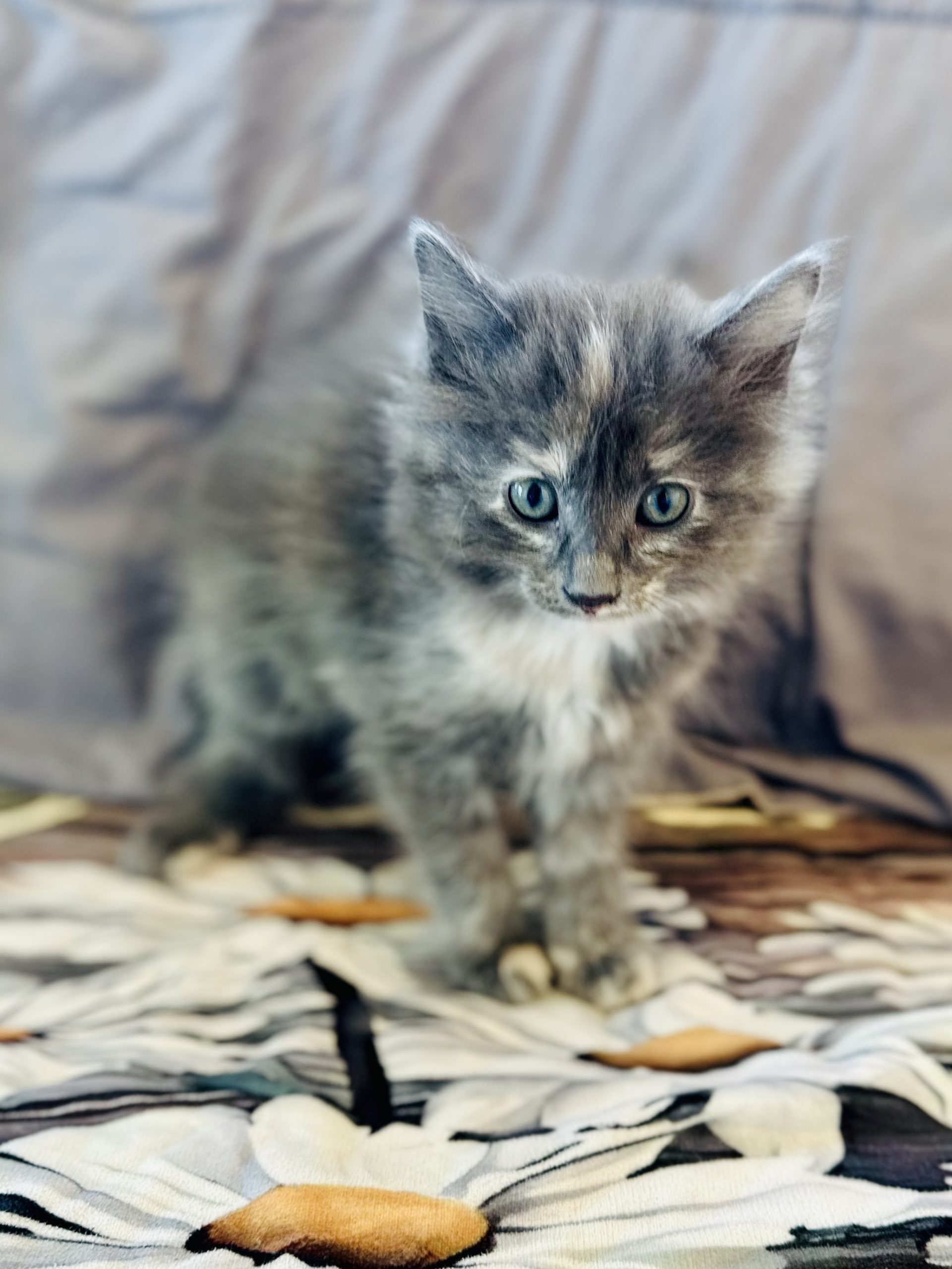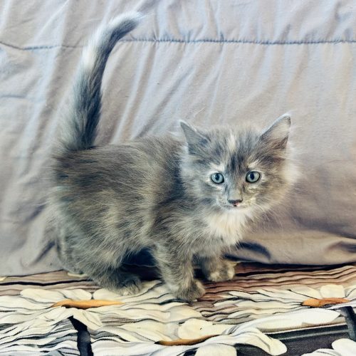 Taffy is a long-haired beauty with a stunning diluted tortoiseshell pattern. As a mama’s mini-me, she’s outgoing and loves to be the center of attention. Taffy is both adventurous and affectionate, always eager to explore her surroundings or curl up in a warm lap for a cuddle. Her friendly and loving demeanor makes her a joy to be around.