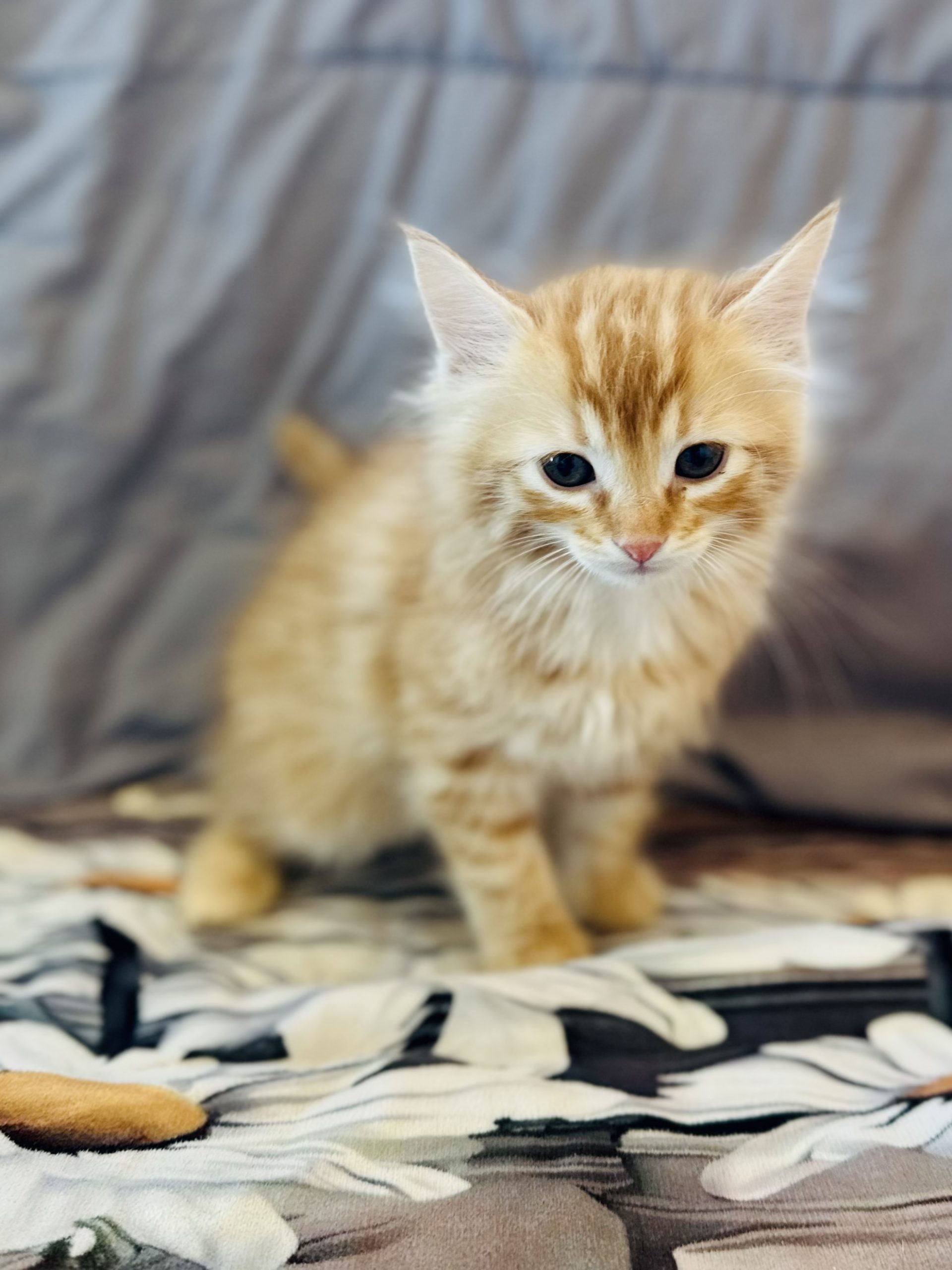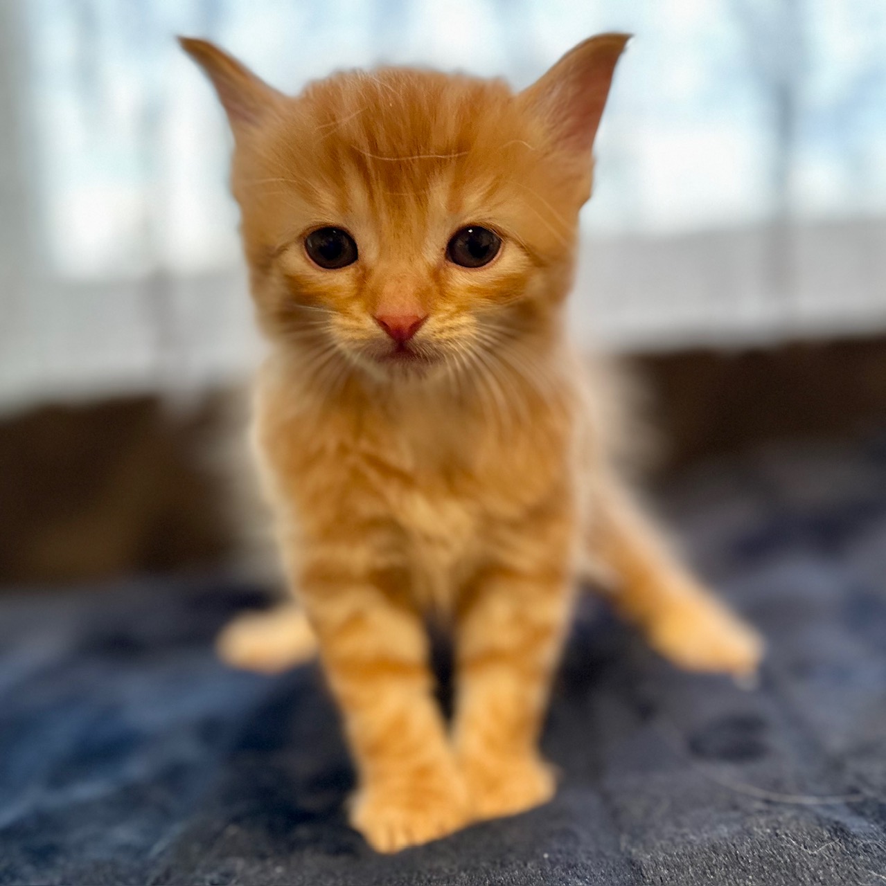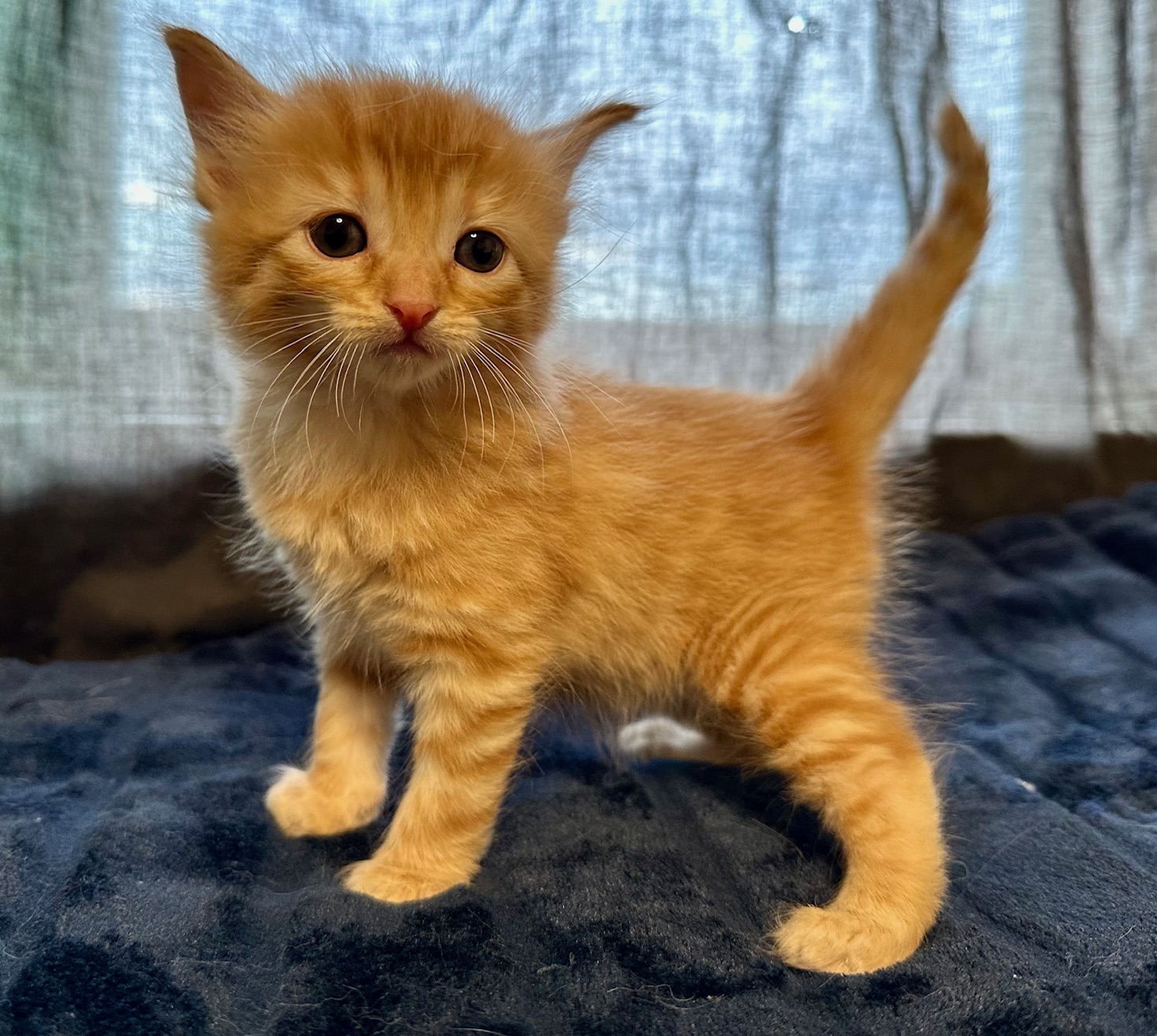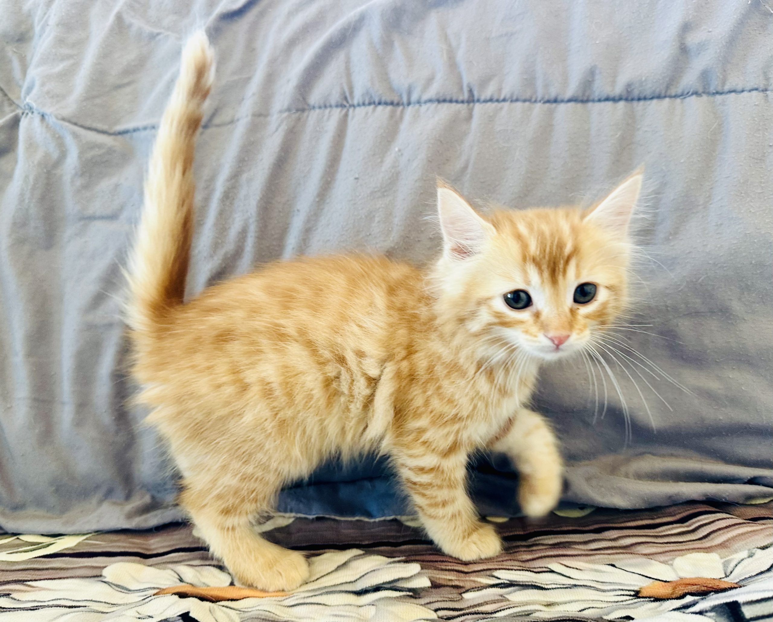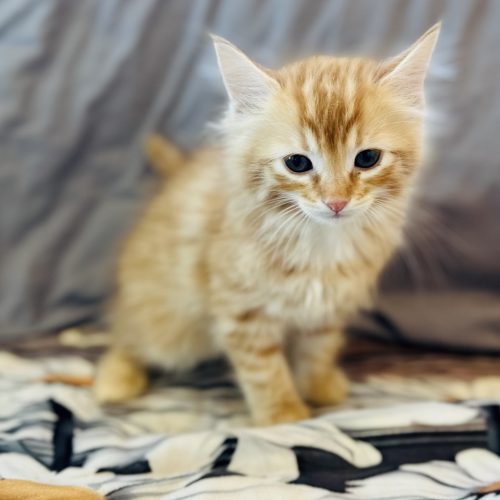 Starburst is a long-haired female orange tabby with a gentle and affectionate personality. Her soft, fluffy coat and bright eyes make her stand out, while her playful nature ensures she’s always ready for a game or a cuddle. Starburst loves to chase toys and snuggle up after a fun play session, making her a sweetheart in every sense.